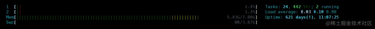 top - 15:26:59 up 621 days, 8:07, 1 user, load average: 0.00, 0.01, 0.05