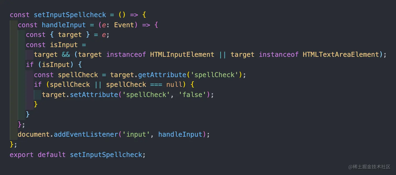 思路就是全局监听input这个事件,并在这个事件里去给触发事件的DOM节点增加spellCheck: false,具体代码为: