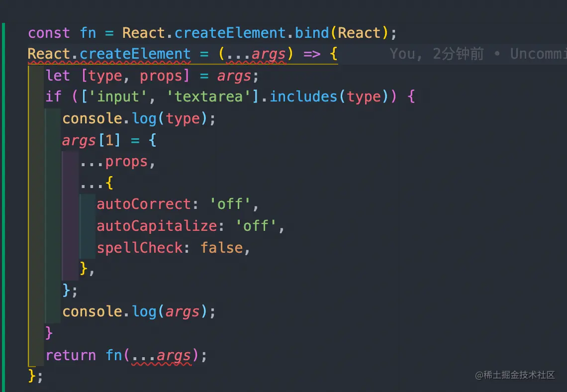 所以思路就是在最终调用React.createElement时,判断如果是input、textarea这两个类型的话,就给标签加上spellCheck: false这个属性,具体代码为