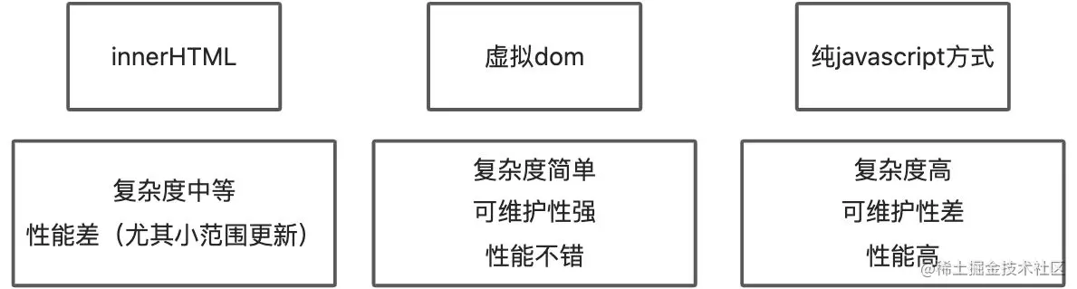 注意上面标记的“可能”,讨论性能,我们需要注意比较“页面大小”、“变更部分”都是有关系,如果我们页面变革内容只是一小块,那么如果通过innerHTML方式的命令式编程性能就会捉襟见肘了;