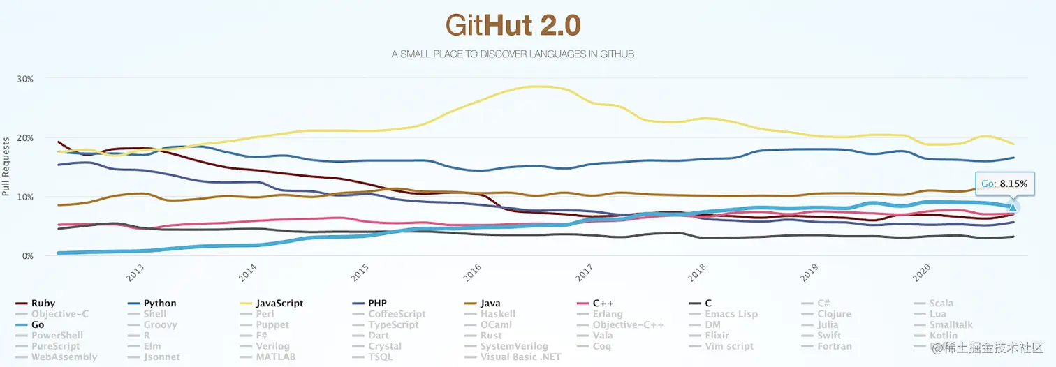 Go不是最流行的开发语言,但在GitHut2.0项目显示,Go在2020年第4季度的Github pull请求年增长率排名第四。这在JavaScript、Python和Java的后面,但在C/C++等传统语言的前面。