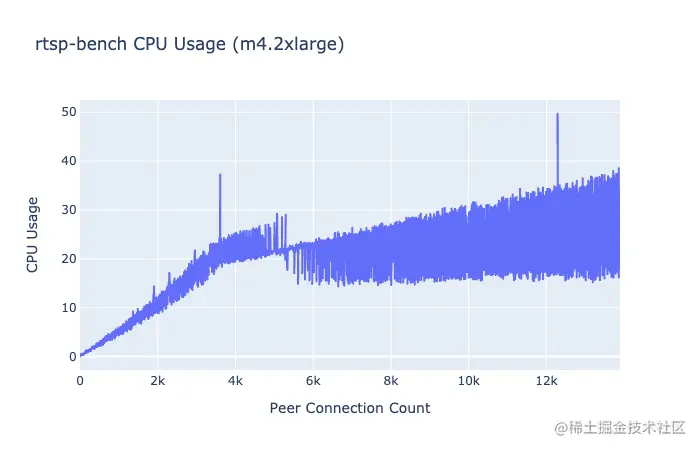 Sean:有的,有一个rtspbench应用,它能启动上千个PeerConnection。你可以看看它的用法。它在Pion仓库组里。我忘记了它的最大阈值,但我想你可以连接30000个PeerConnection。事实上,来看下数据...15000个PeerConnection只占用了25%的CPU使用率。