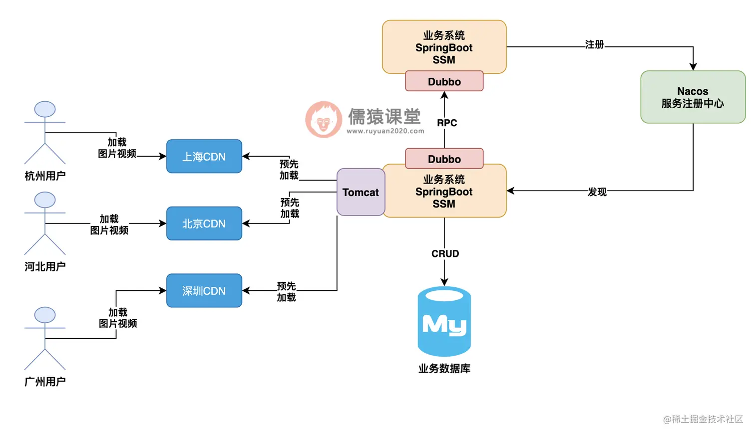 接着呢,全国各地的用户打卡手机APP,想要加载图片和视频的时候,就近找一个距离自己最近的CDN服务器加载图片和视频就可以了,这样就可以让超高流量分散到全国各地的很多CDN服务器上去了,大家看下图。