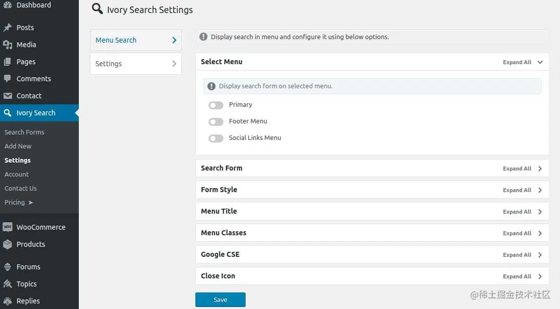 当你在 Ivory Search 表单中工作时,将鼠标悬停到 Settings 选项(在 Ivory Search 下仪表板的左侧面板上),以设置搜索框的位置。这可以在页眉或页脚或水平菜单等中。菜单搜索部分中可用的选项是特定于主题的。