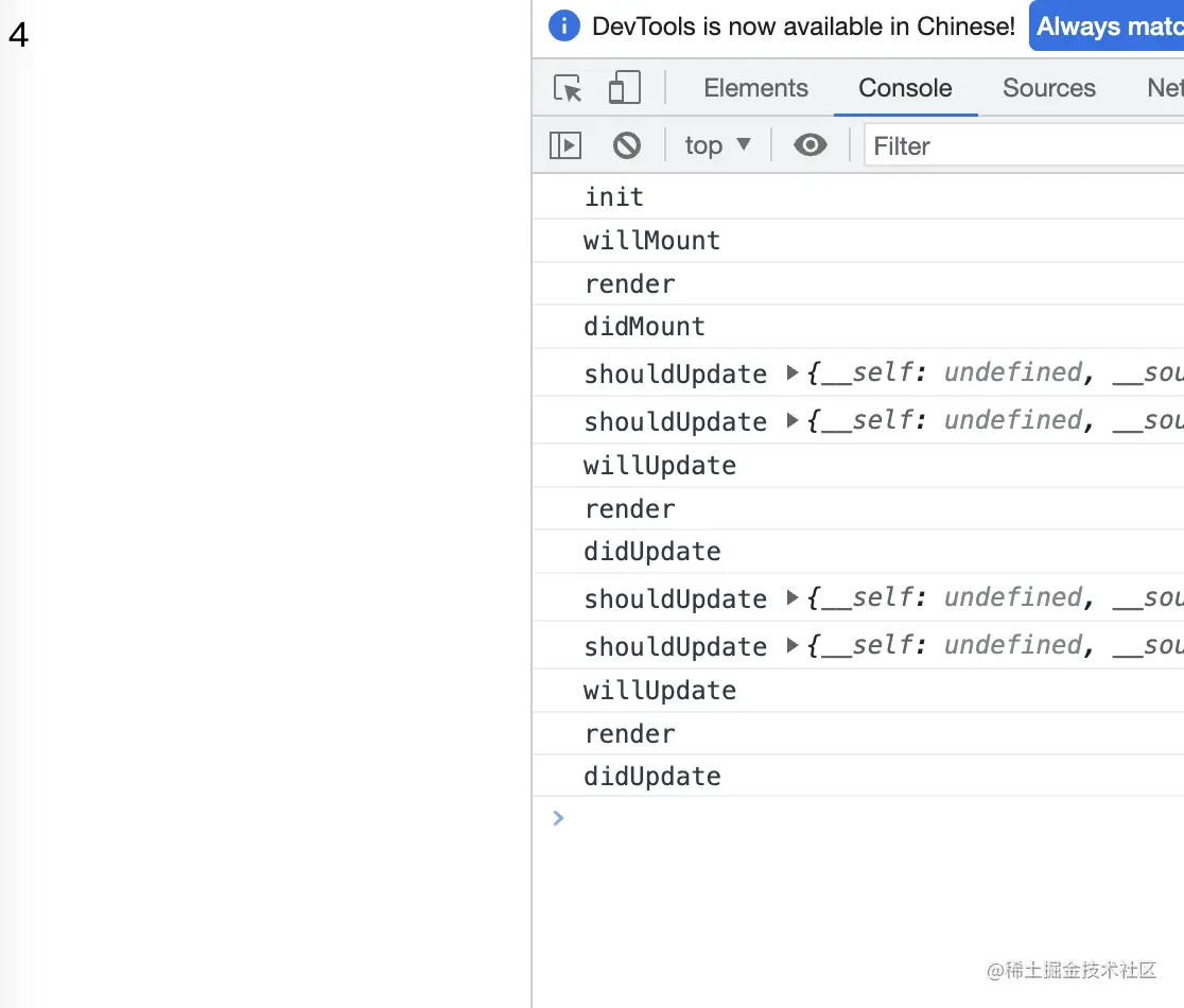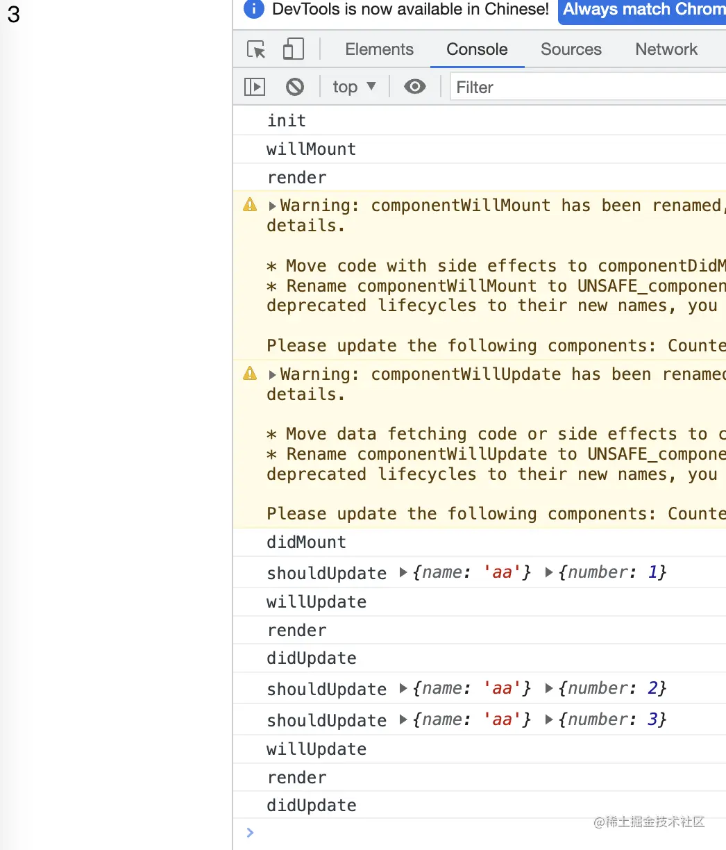// react 涉及到 will 的生命周期被报不安全,需要使用 UNSAFE_componentWillUpdate,我们这里先不考虑直接实现