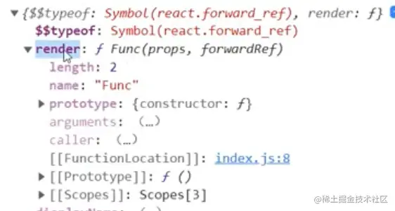 forwardRef 方法返回了个对象,包括两个属性,render 函数对应的就是我们自己写的函数组件,传入 props 和 ref 属性。我们自己实现一下吧