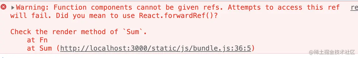 查看浏览器我们看到会打印如下的异常警告:这是告诉我们如果想函数组件使用 ref 的话需要使用 forwardRef 方法进行包裹。