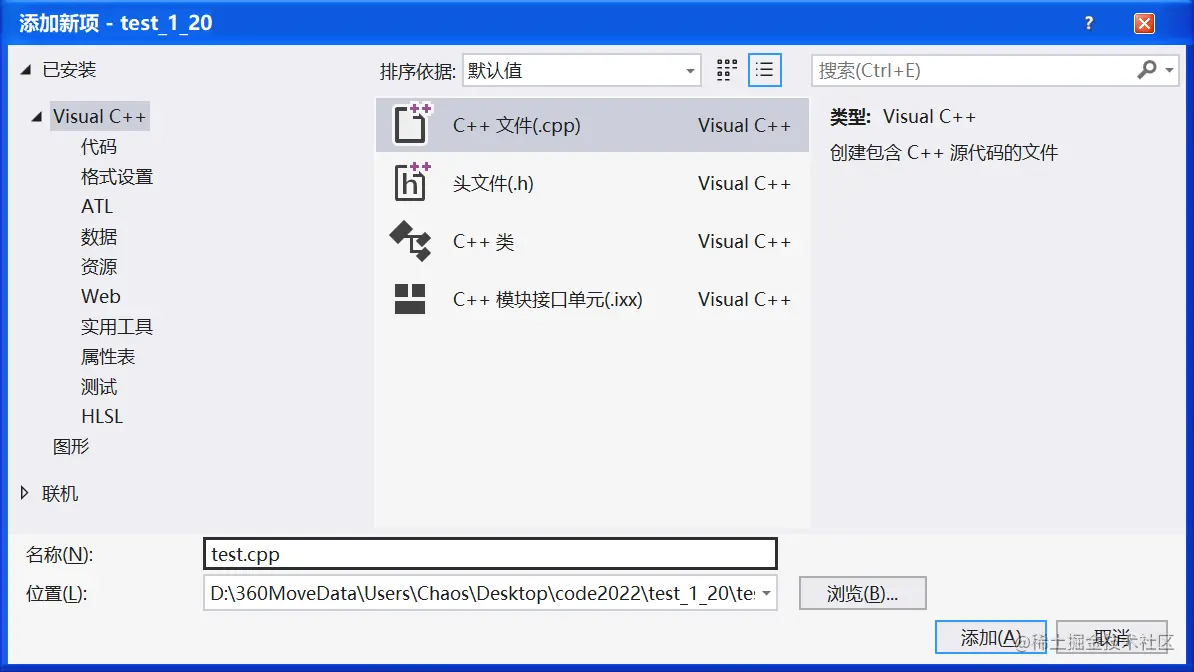 打开编译器创建完新项目后,右键源文件,点击 "添加新建项" ,名称我们就取为 test.cpp,这样我们的代码就能很好地创建出来了:
