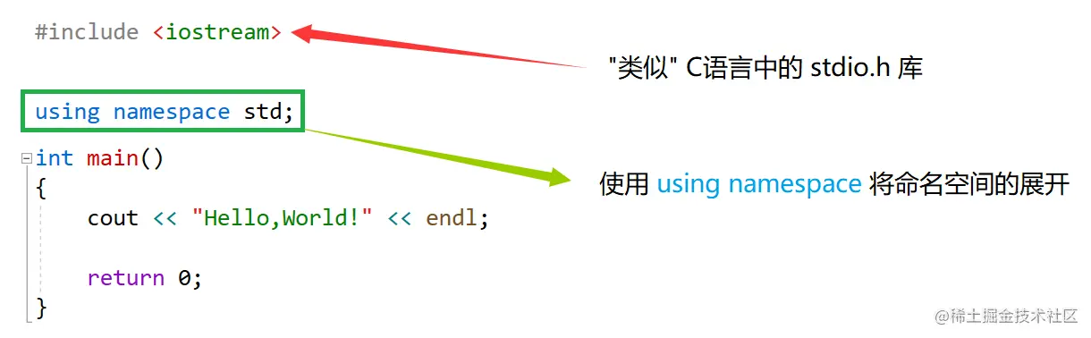 并且需要使用 std 标准命名空间,这里我们下面会详细探讨。