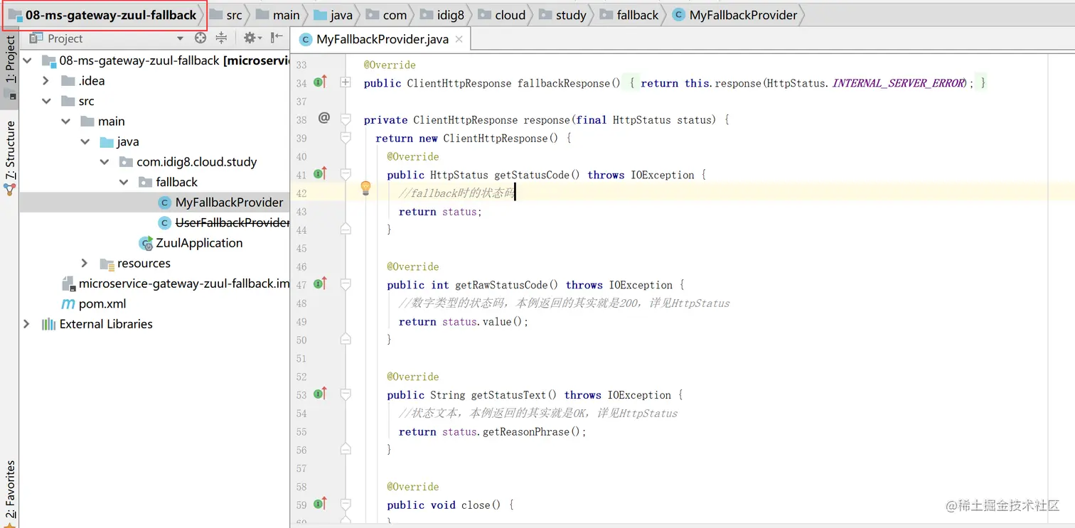 源码:08-ms-gateway-zuul-fallback 编写zuul的降级回退类如下