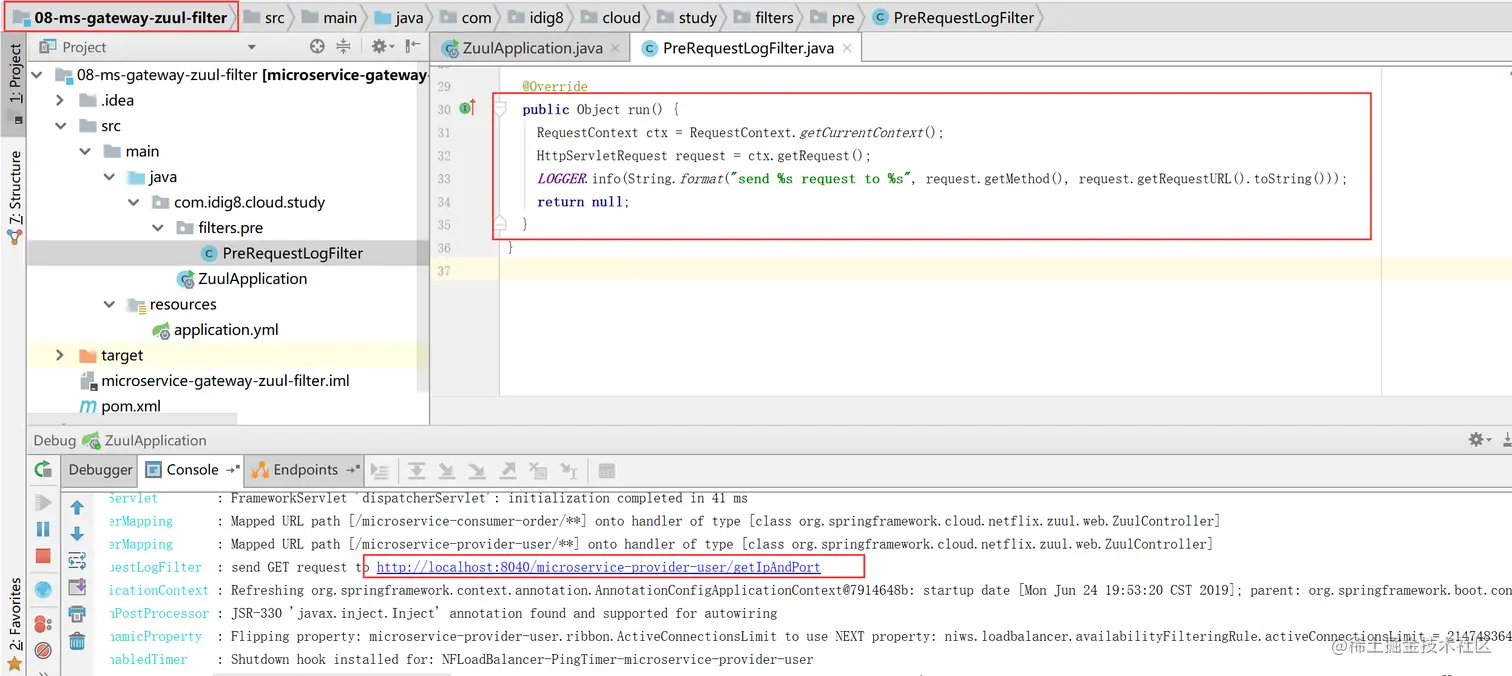 运行项目访问地址:http://localhost:8040/microservice-provider-user/getIpAndPort 可以看到zuul服务的后台正常打印了run方法里的日志。