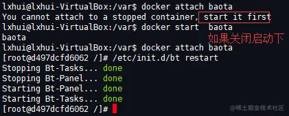 使用:docker ps -a 查看所有容器。docker attach 容器id或者直接 docker attach baota