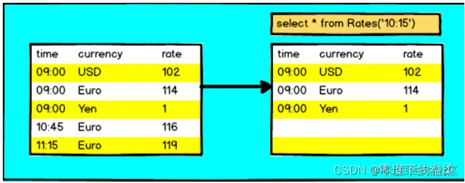 使用事件时间属性(即行时间属性),可以检索过去某个时间点的键值。这允许在一个共同的时间点连接两个表。