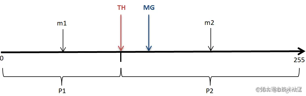 - 第一部分是小于假定阈值TH的那部分。这一部分的平均灰度值为m1,这一部分在整幅图中出现的概率为P1