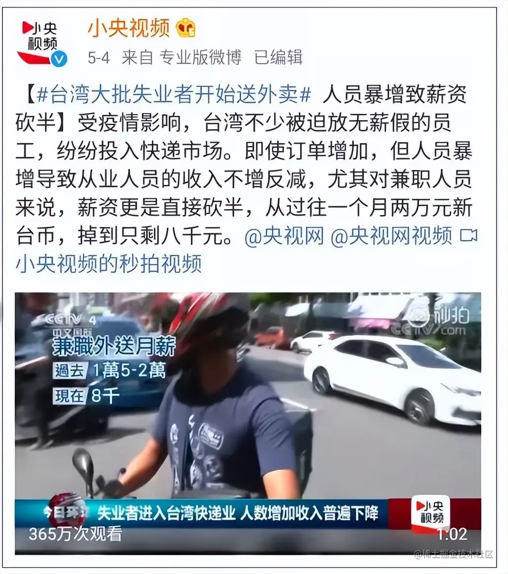 中国台湾省刮起失业潮,大批失业者开始送外卖。