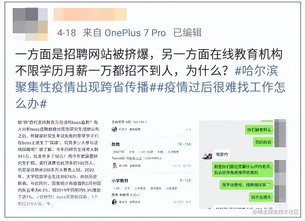 一方面因为求职人数太多,BOSS直聘的APP被挤爆,找工作压力很大,但另一方面,在线教育抛出橄榄枝,月薪一万都找不到满意的人。