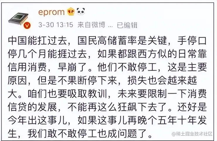 中国能在疫情中扛过去,国民高储蓄率是关键,如果都跟西方似的日常靠信用消费,早崩了。