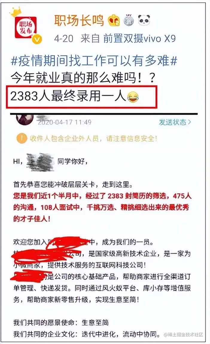 在一个招聘网站上有一个常规的职位,应聘的人竟然有2383人,但只录取一个人。