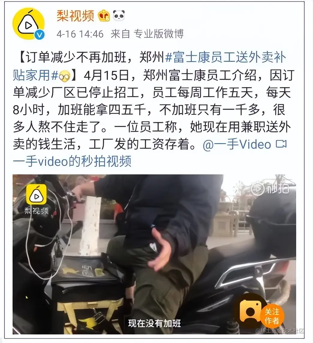 一名富士康的员工说,公司宣布不加班了,工资只有一千多,很多人熬不住走了,她现在只能靠兼职送外卖维持生活。