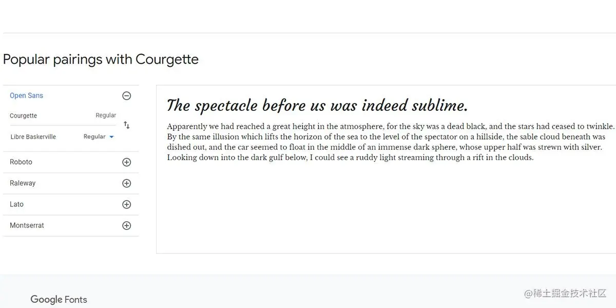 你可以将Courgette与华丽的Libre Baskerville结合起来,形成一种精致的字体搭配。由于其宽大的反形,这种开源的衬线字体很容易在屏幕上阅读。这就是为什么你也可以将Libre Baskerville用于较长的文本体。如果你想要一个安全但时尚的谷歌字体配对,请选择这个组合。