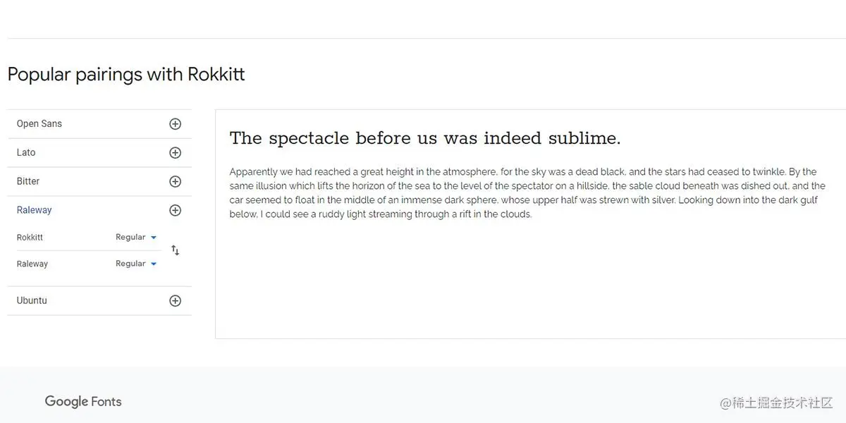 如果你正在寻找Rokkitt的搭配,美丽的无衬线字体Raleway也是完美的搭配。Rokkitt Black和Raleway之间有鲜明的区别,这将产生引人注目的效果。如果你在寻找另一种选择,你也可以尝试用Raleway Dots与Raleway一起做标题。