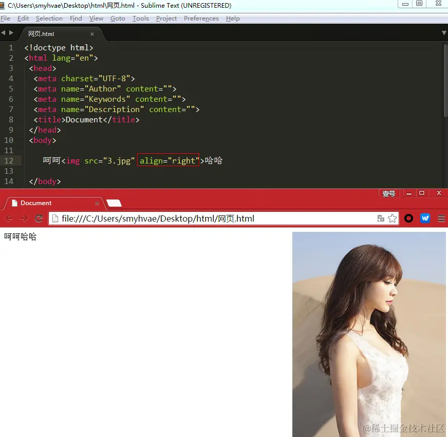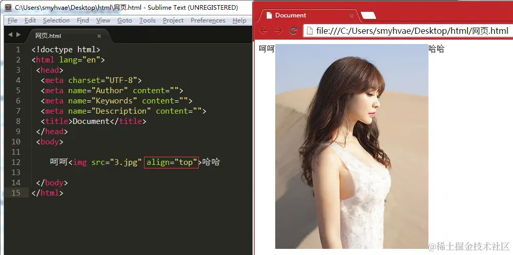 3、align="top":图片与文字顶端对齐。显示效果: