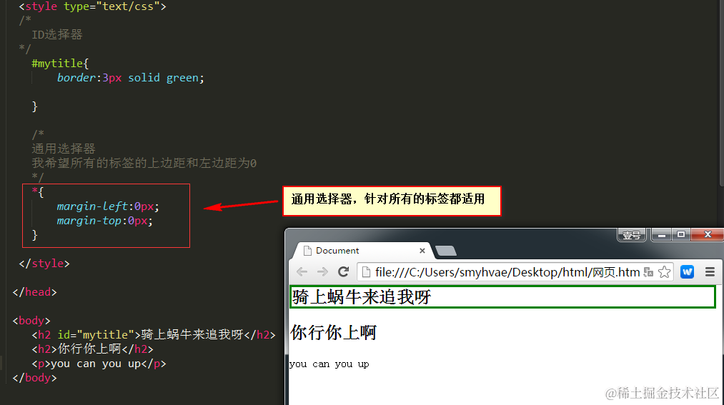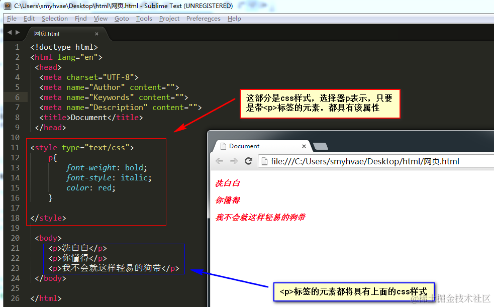 我们写css的地方是style标签,就是“样式”的意思,写在head里面。后面的课程中我们将知道,css也可以写在单独的文件里面,现在我们先写在style标签里面。