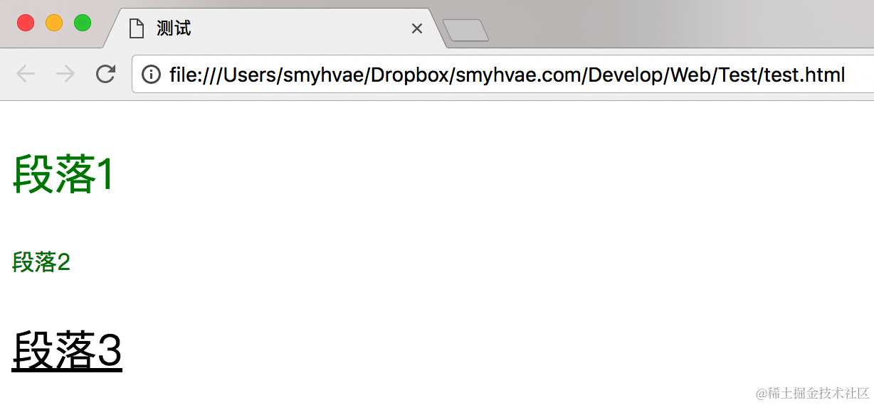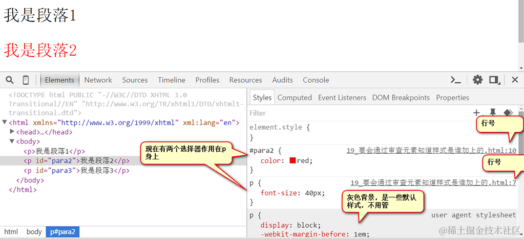 上面css中的div div p,也能使文字的颜色变红。通过浏览器的审查元素,我们可以看到 p元素的祖先列表:
