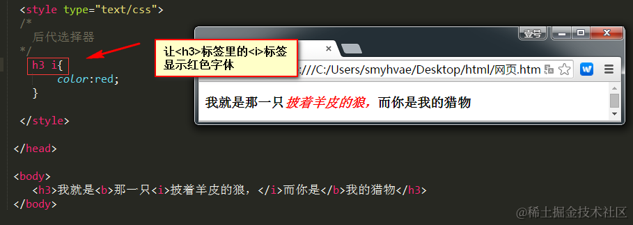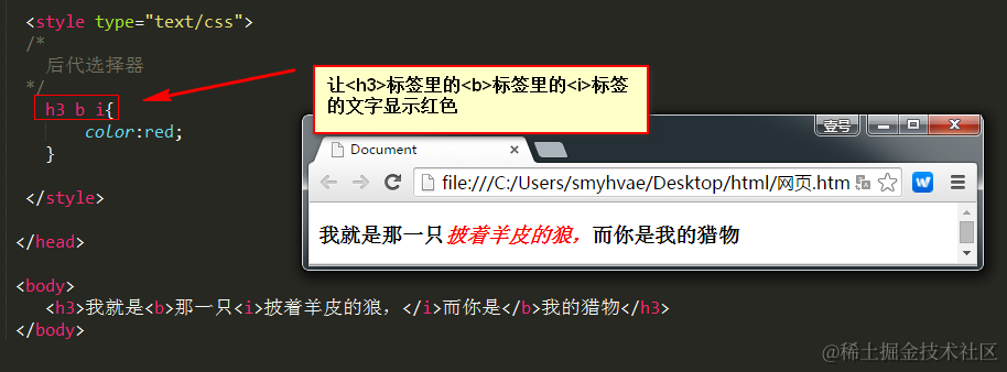 上面的这种写法,<h3>标签和<i>标签并不是紧挨着的,但他们保持着一种后代关系。