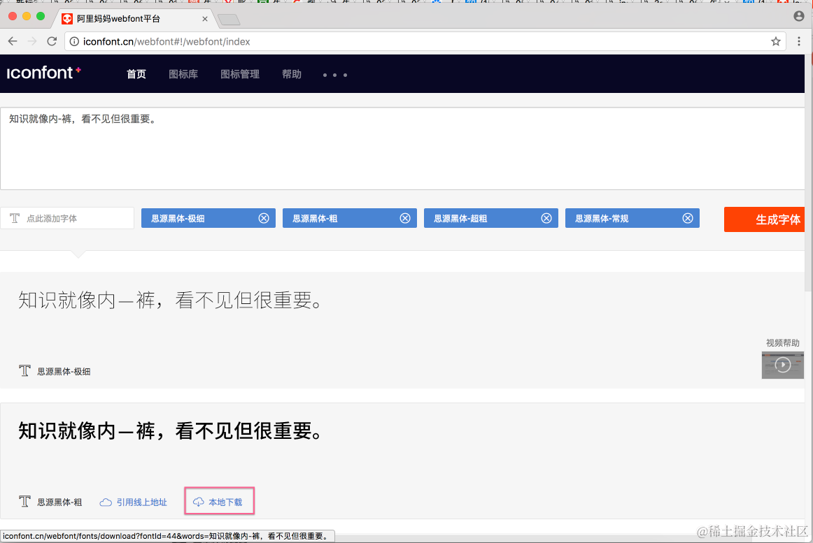 上图中,比如我想要「思源黑体-粗」这个字体,那我就点击红框中的「本地下载」。