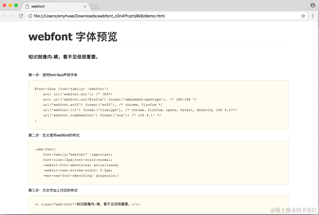上图中, 我们把箭头处的html文件打开,里面告诉了我们 webfont 的使用步骤: