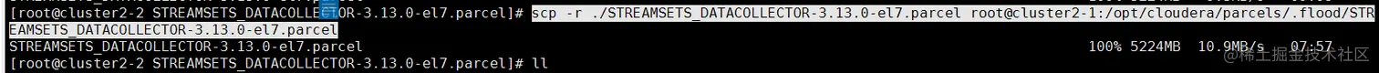 [root@cluster2-2 STREAMSETS_DATACOLLECTOR-3.13.0-el7.parcel]# scp -r ./STREAMSETS_DATACOLLECTOR-3.13.0-el7.parcel root@cluster2-1:/opt/cloudera/parcels/.flood/STREAMSETS_DATACOLLECTOR-3.13.0-el7.parcel