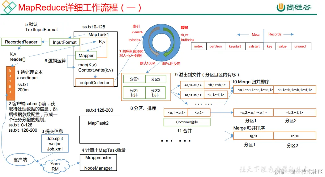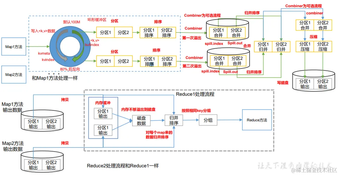 在进行文件合并过程中,MapTask以分区为单位进行合并,对于某个分区,它将采用多轮递归合并的方式。每轮合并mapreduce.task.io.facyor(默认10)个文件,并将产生的文件重新加入待合并列表中,对文件排序后,重复以上过程,直到最终得到一个大文件。