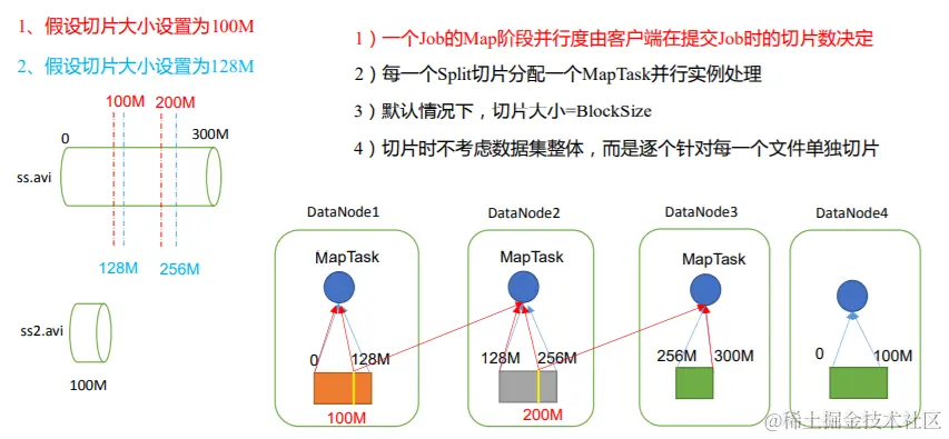 - 数据切片:数据切片只是在逻辑上对输入进行分片,并不会在磁盘上将其切分成片进行存储。数据切片是MapReduce程序计算输入数据的单位,一个切片会对应启动一个MapTask