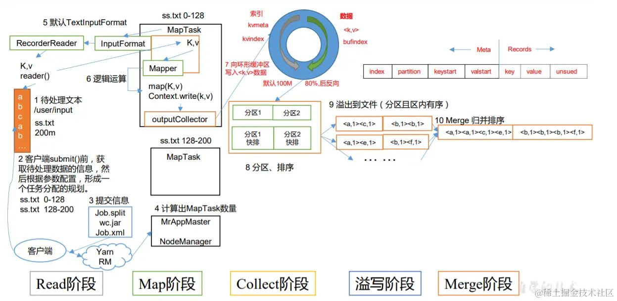 (1)Read阶段:MapTask通过InputFormat获得的RecordReader,从输入InputSplit中解析出一个个key/value