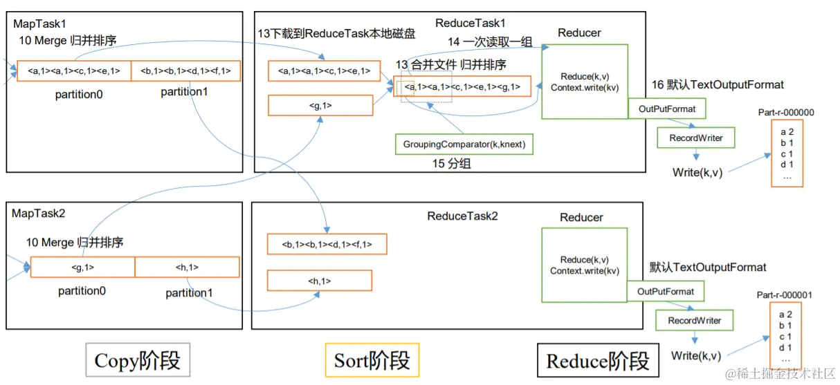 (2)Sort阶段:在远程拷贝数据的同时,ReduceTask启动了两个后台线程对内存和磁盘上的文件进行合并,以防止内存使用过多或磁盘上文件过多。按照MapReduce语义,用户编写reduce()函数输入数据时按key进行聚集的一组数据。为了将key相同的数据聚在一起,Hadoop采用了基于排序的策略。由于各个MapTask已经实现对自己的处理结果进行了局部排序,因此,ReduceTask只需对所有数据进行一次归并排序即可
