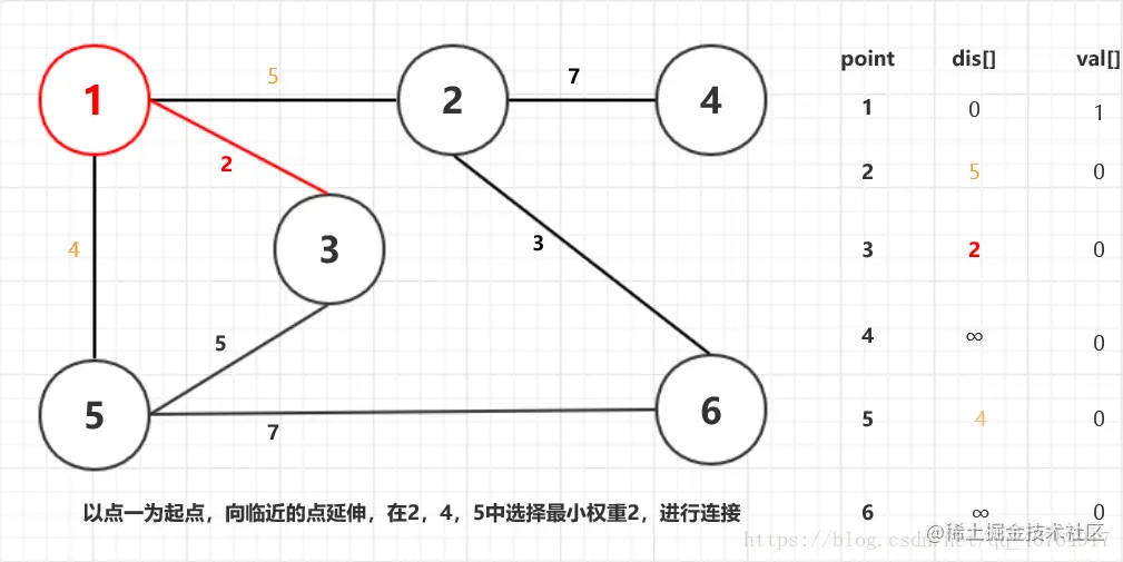 Prim算法的思想是:取图中任意一点作为起点放入树中,并向邻近树的点不断延伸,每次延伸的点要求满足到树的距离最短。