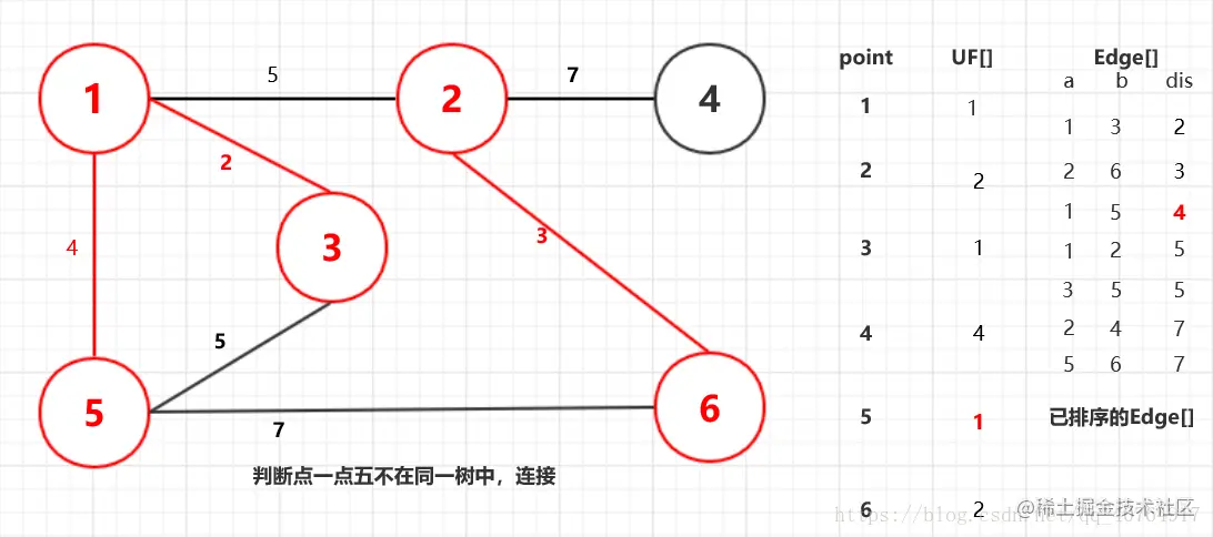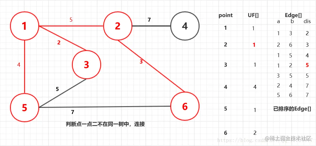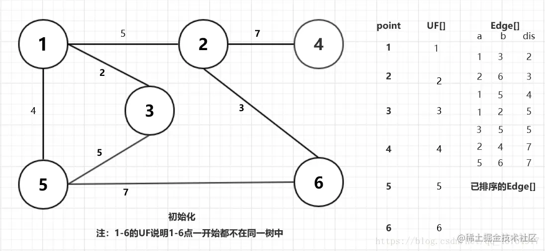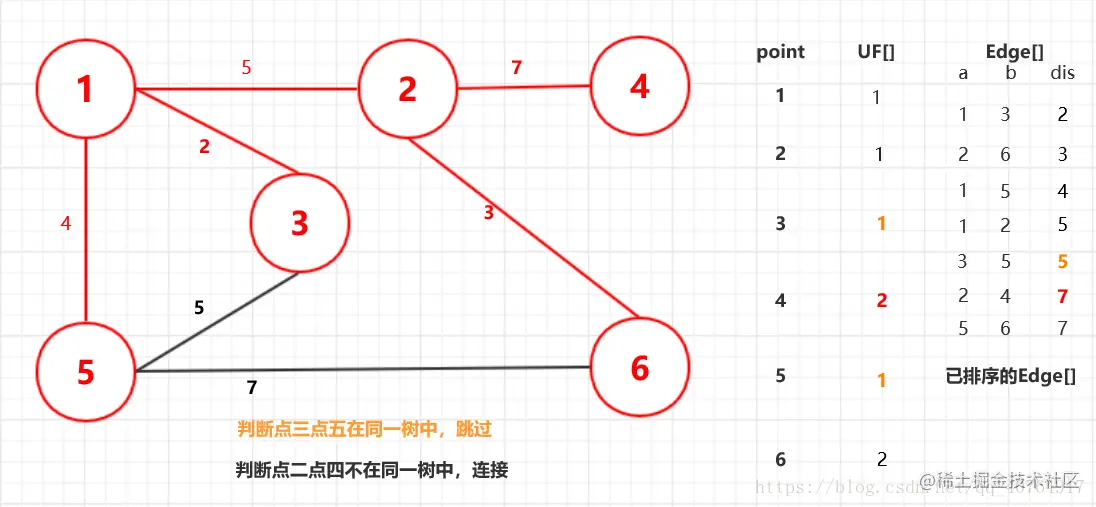 这里我们需要边(Edge)结构,包含数据a,b两端点,以及距离dis;和判断两点是非在一颗树里的并查集数组UF[]。