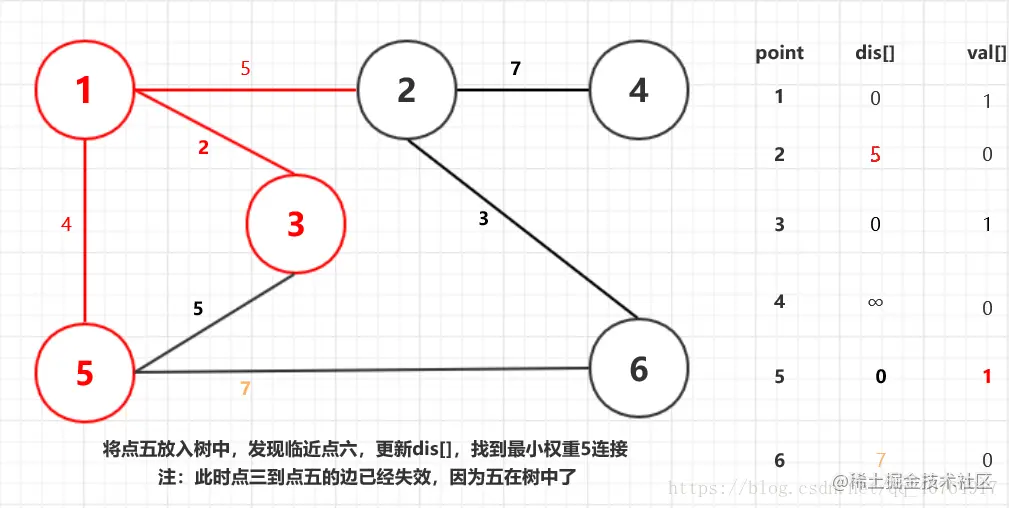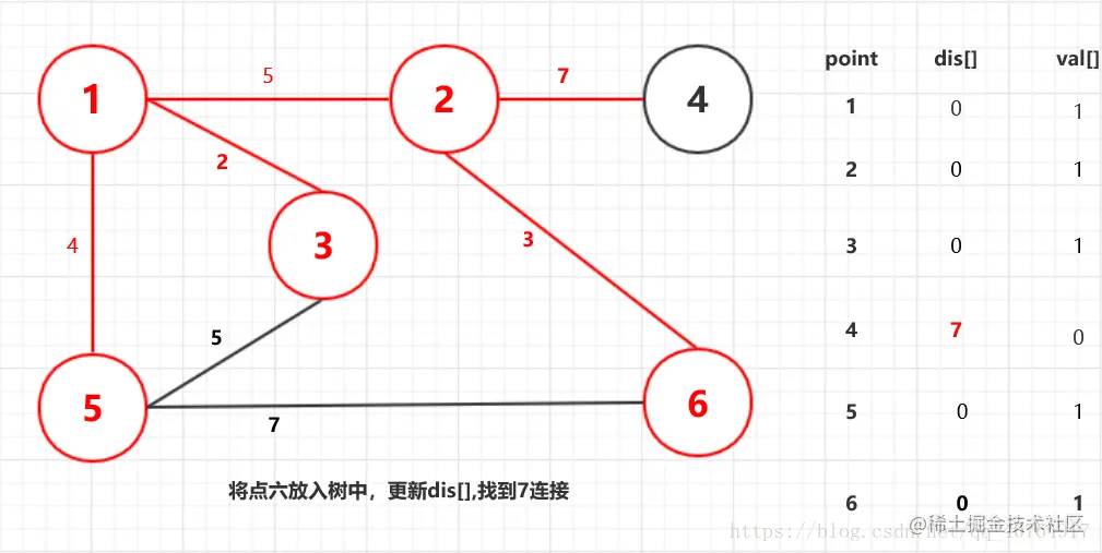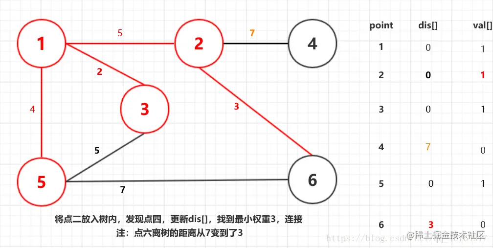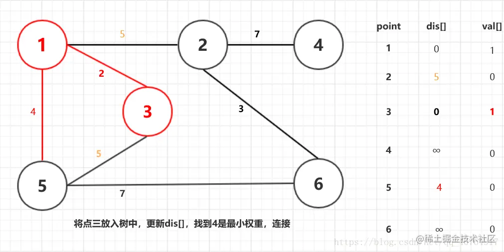 我们采用dis[]记录点离树的距离,并采用val[]标记在树中的点,两数组实时更新。