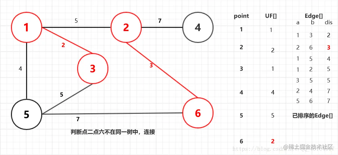Kruskal算法的思想是:将边按权重从小到大排序,依次选取边上的两点进行连接,只要满足边上两点不在同一树中就行。