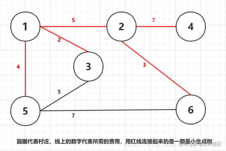我们要求解决的是求出 把这些点(村庄)都连起来(修公路)时的所构成的树的权重总和最少(最少费用)是多少,即最小生成树的权重和。