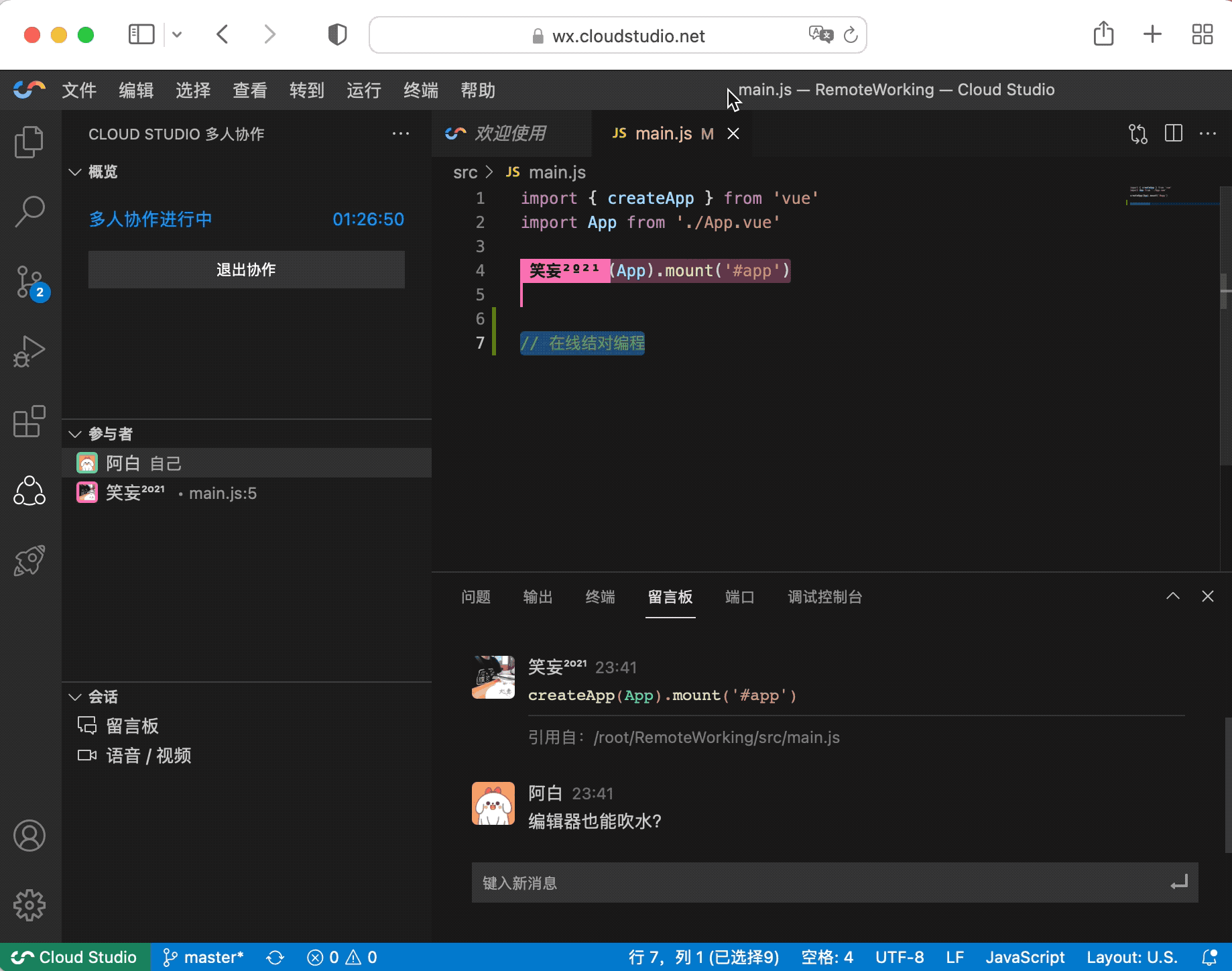 这就是所有代码协作都会设计到的功能:实时共享代码编辑,跟随团队其他成员的光标。