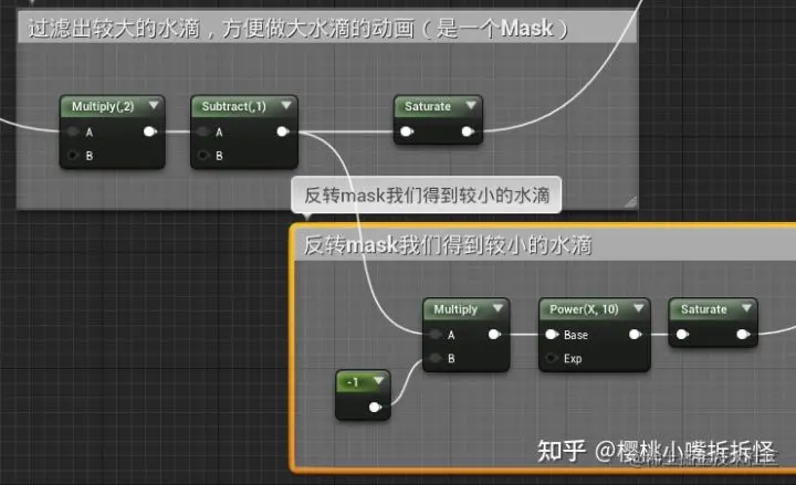 水从高处掉落在物体表面(不太平坦的表面),较大的水滴受重力影响,会有移动,这里我们过滤出大水滴,叠加上我们的动画效果来模拟这一部分