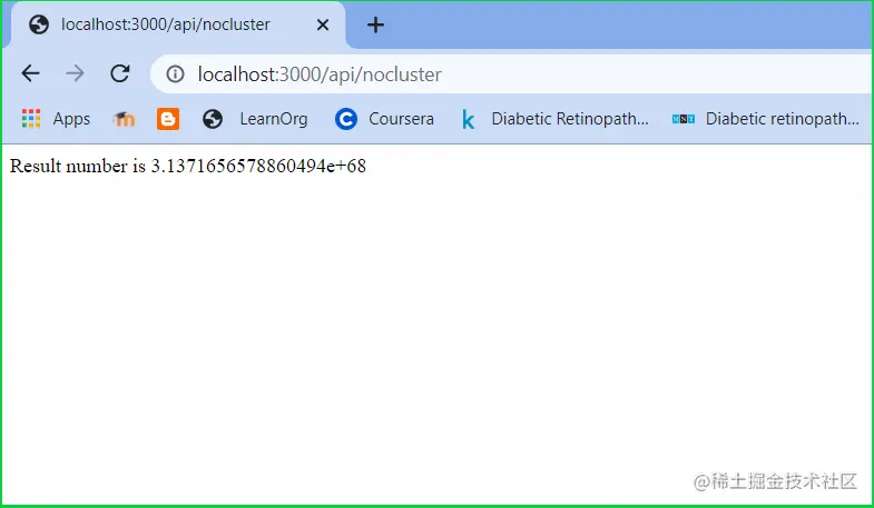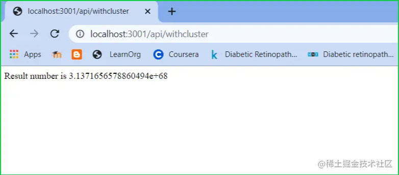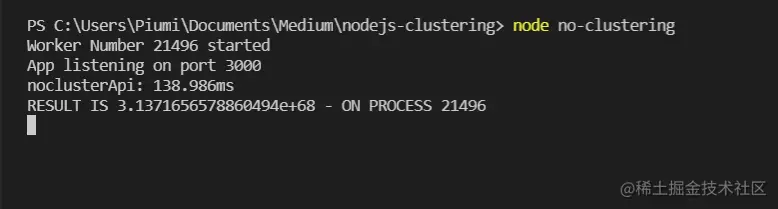 用node no-clustering.js运行服务器,在进入http://localhost:3000/api/nocluster,你将能看到以下输出。