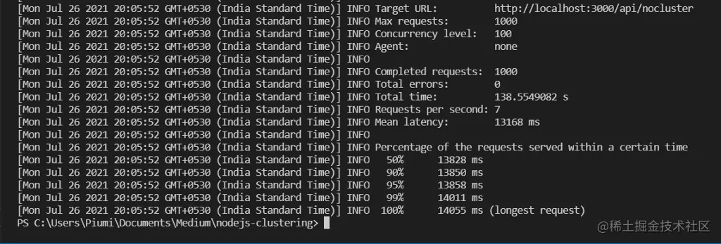 为了说明集群对NodeJS应用程序性能的影响,让我们通过对这两个应用程序进行负载测试来测试它们如何管理大量的传入连接。这将用loadtest包进行。