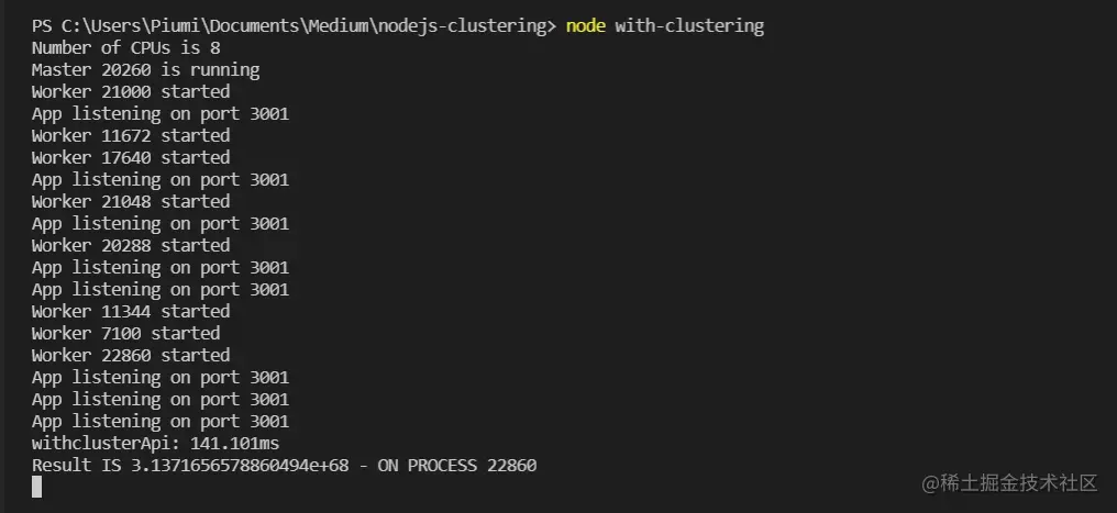 当你在with-clustering.js文件中运行上述代码时,它将在http://localhost:3001/api/withcluster,给出以下输出。