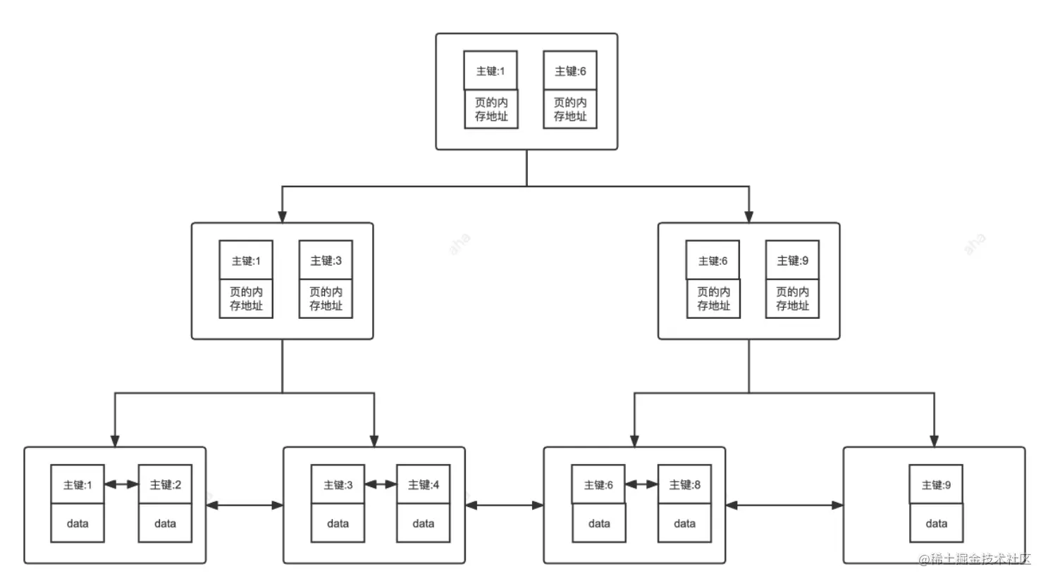 非叶子节点存放索引,叶子节点存放索引和索引对应的数据。