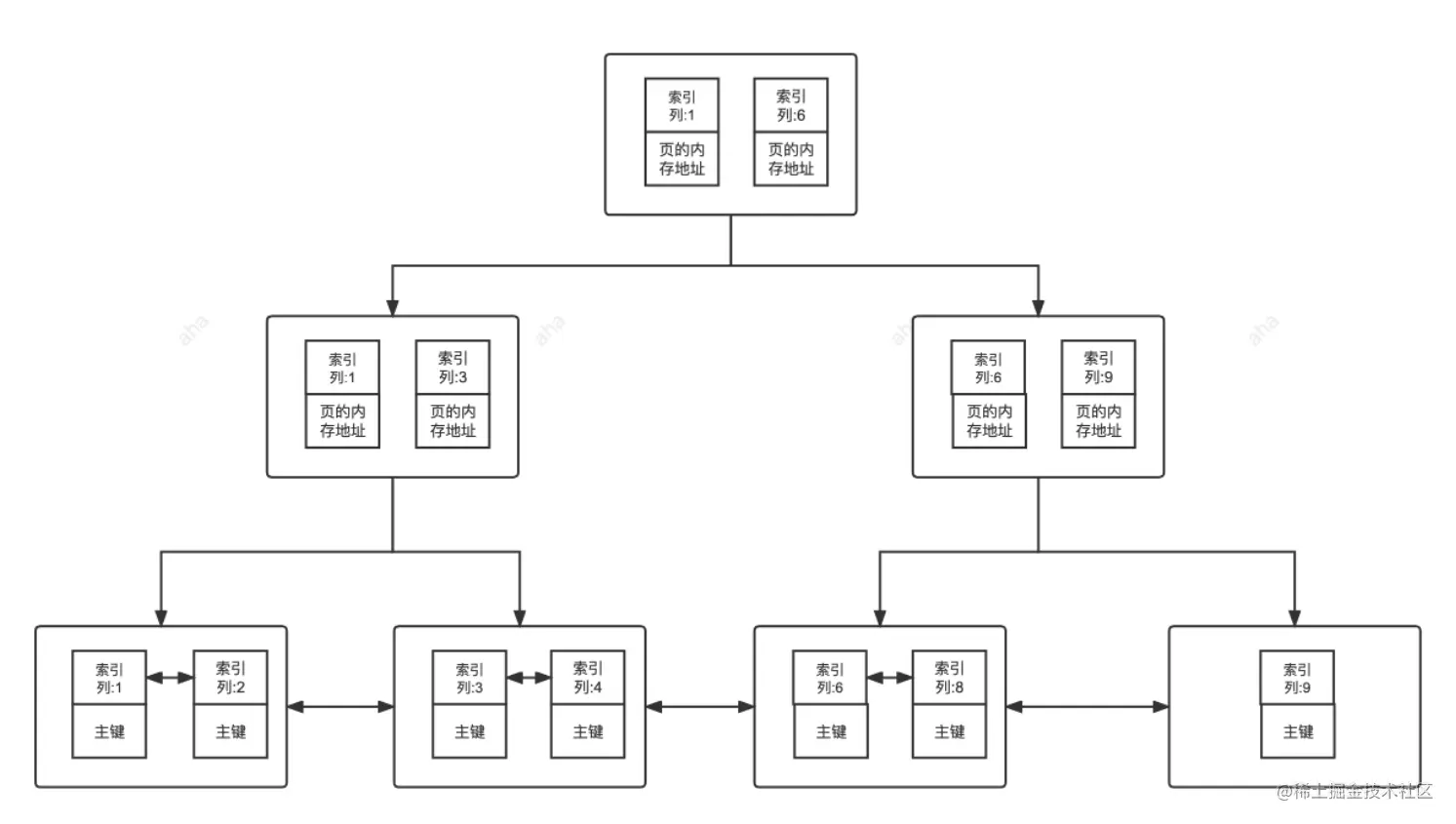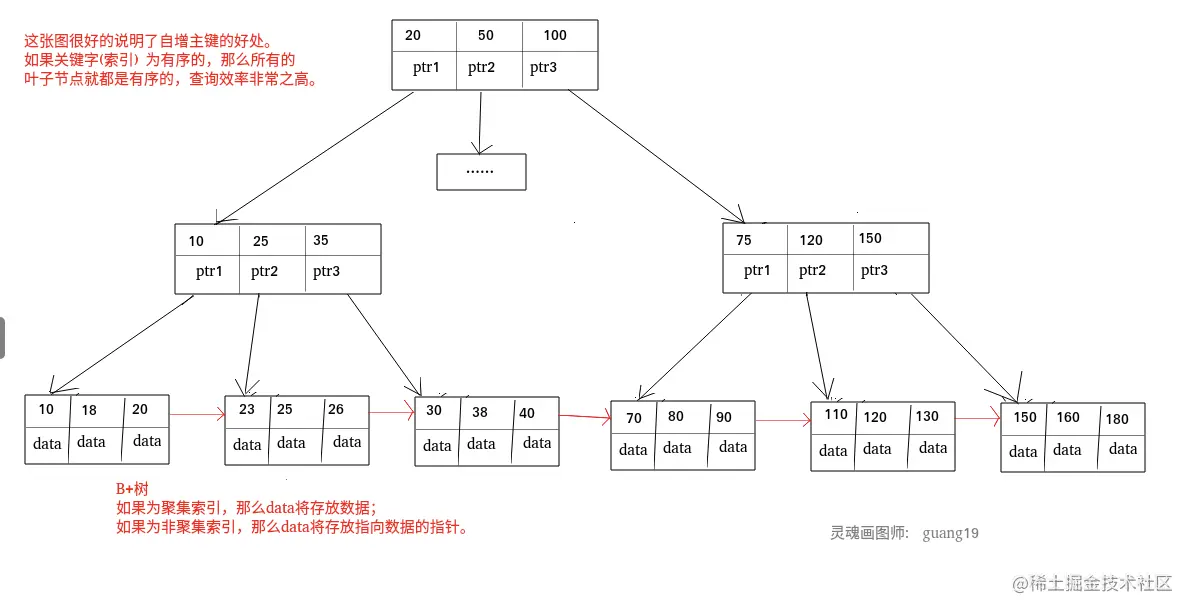 。 - B树的叶子节点都是独立的,而B+树的叶子节点都有一条引用链指向它相近的节点。