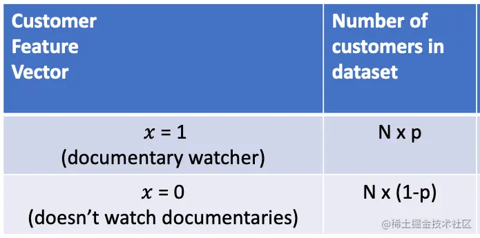 为了简单起见,设想你的客户特征向量_x_只有一个元素:它是一个二元变量,如果有关客户曾经在Netflix上看过一部纪录片,它就是1,如果没有,就是0。