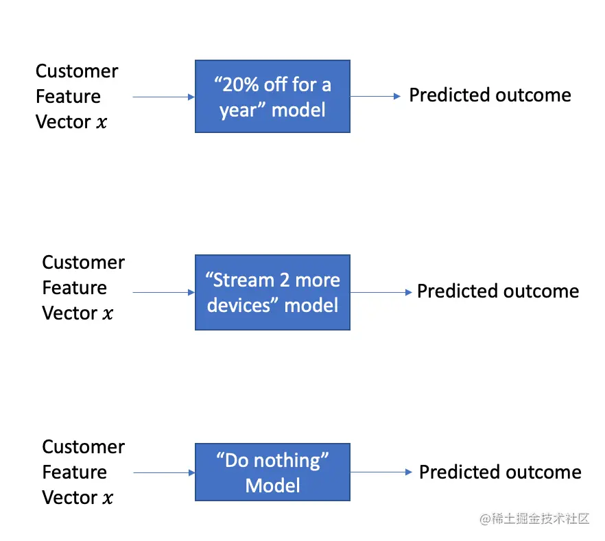第3步:对于任何客户特征向量_x_,通过 每个模型运行_x_ ,得到其行动的预测结果。